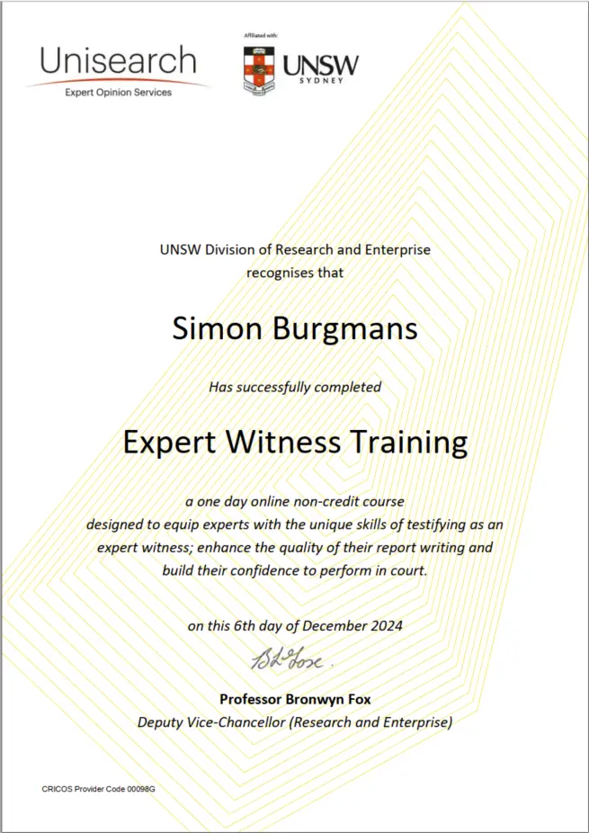 We are pleased to share that Simon Burgmans of in2Dredging (i2D) successfully completed Unisearch’s online Expert Witness training course. This highly regarded course equips participants with essential skills for testifying as expert witnesses and enhancing the quality of their expert witness reports. It also fosters the confidence needed to perform effectively in any arbitral or court proceedings. By combining this training with his Expert Determiners Certification from the Resolution Institute, Simon gained a thorough understanding of an expert witness’s obligations. This foundation ensures he is well-prepared when called upon to provide an expert opinion, which can serve as admissible evidence.